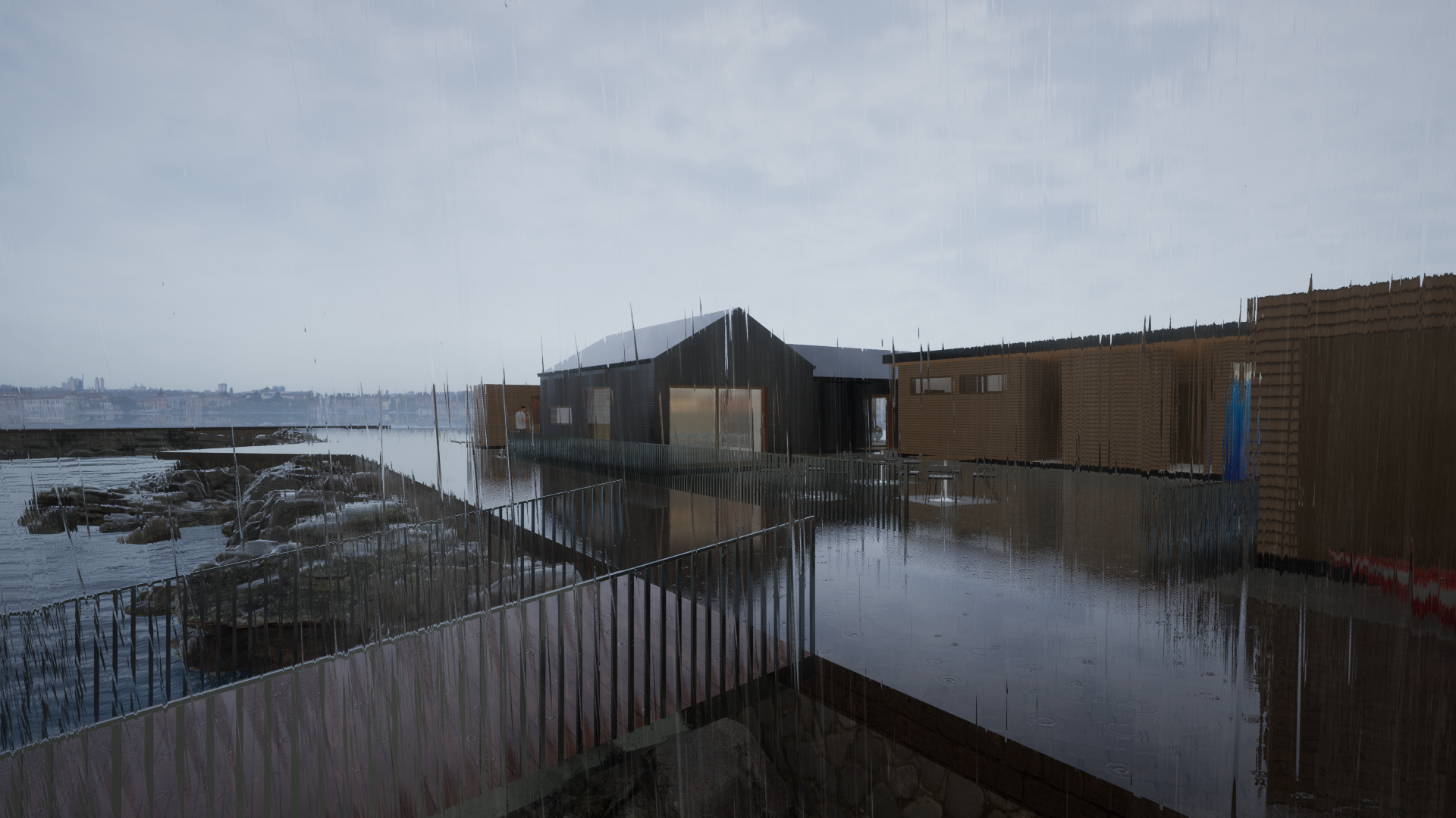Given the exposed nature of the site on the side of Methil Dock, the design approach was for a series of small buildings arranged around a central meeting space that would provide a degree of shelter from the elements.